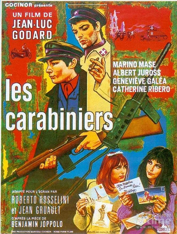 Do periferního bivaku dvou primitivních mladíků a jejich neméně negramotných slečen – jejichž tristní osobnosti Godard ještě ironicky zvýraznil mytologickými jmény – vtrhává trio karabiniérů, táhnoucí zemí a verbující mladé muže do čerstvě vyhlášené války domovské Francie se sousední Itálií. Lákadlem pro vstup do legií je Michelangelovi a Odysseovi přednáška o tom, co je dovoleno, co je vůbec možno ve válce dělat a zažít, korunovaná příslibem absurdní odměny: „budete si moci v zemi nepřítele vzít cokoli, co uvidíte, přisvojit si z pokořeného národa cokoli, co se vám bude líbit“. Vize povoleného "vraždění, zlodějen, rozbíjení výloh obchodníků, znásilňování žen a bití dětí a starců" mládence ohromí natolik, že se k legiím nadšeně přihlásí. Chladný film o naivní chamtivosti obyčejných pěšáků a jejich snaze dobýt svět připomíná svojí formální střízlivostí a statičností absurdní divadlo.(Renesco)